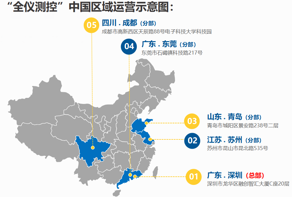 “全儀測控”建立了覆蓋國內(nèi)大部分地區(qū)的營銷網(wǎng)絡(luò),在 深圳 、 東莞 、 蘇州 、 成都 、 青島 等地設(shè)有公司 ,