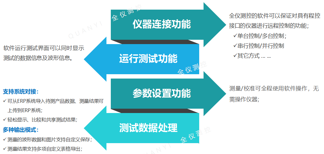 全儀自動測試系統(tǒng)軟件可以實現(xiàn):儀器識別操作、參數(shù)設(shè)置、運行測試、數(shù)據(jù)&報表4大功能。