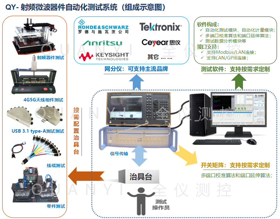 “全儀測控”敏銳的發(fā)現(xiàn)了這個市場機(jī)會,經(jīng)過潛心的研發(fā)和實踐,推出了“QY射頻微波器件自動化測試系統(tǒng)”,該系使用專業(yè)的測試軟件進(jìn)行測試,整個測試流程在電腦上完成,減少人為干擾因素,測試效率更高、測試結(jié)果更精確,還擁有強大的數(shù)據(jù)庫功能存儲數(shù)據(jù),并且實現(xiàn)測試數(shù)據(jù)的智能化分析,提高數(shù)據(jù)利用價值,為后續(xù)產(chǎn)品改善提供可靠依據(jù)。