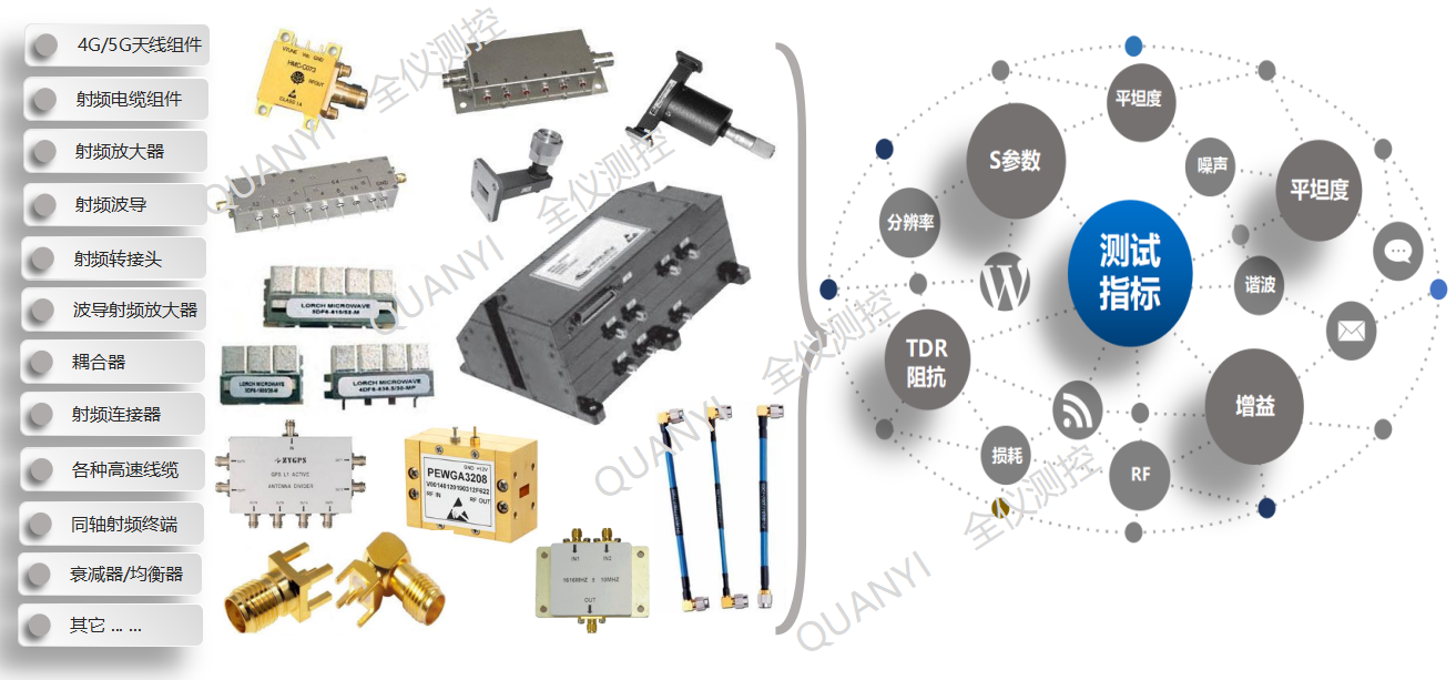 為保證通信的可靠,射頻器件在生產(chǎn)過程中都會經(jīng)過絕緣耐壓、外觀、電氣性能等一系列的測試,其中最重要的是電氣性能,也就是使用網(wǎng)絡(luò)分析儀進(jìn)行S參數(shù)測試,常見的射頻器件包括:射頻線纜、連接器、濾波器、功分器、天線、放大器、衰減器、混頻器和耦合器等。